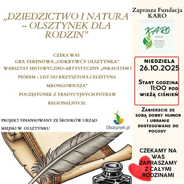 Fundacja KARO zachęca wszystkich do udziału w wydarzeniu, które stanowi doskonałą okazję do wspólnego spędzenia czasu, poznania historii Olsztynka oraz docenienia piękna lokalnej przyrody i kultury. Organizatorzy przypominają o zabraniu wygodnego stroju odpowiedniego do pogody.