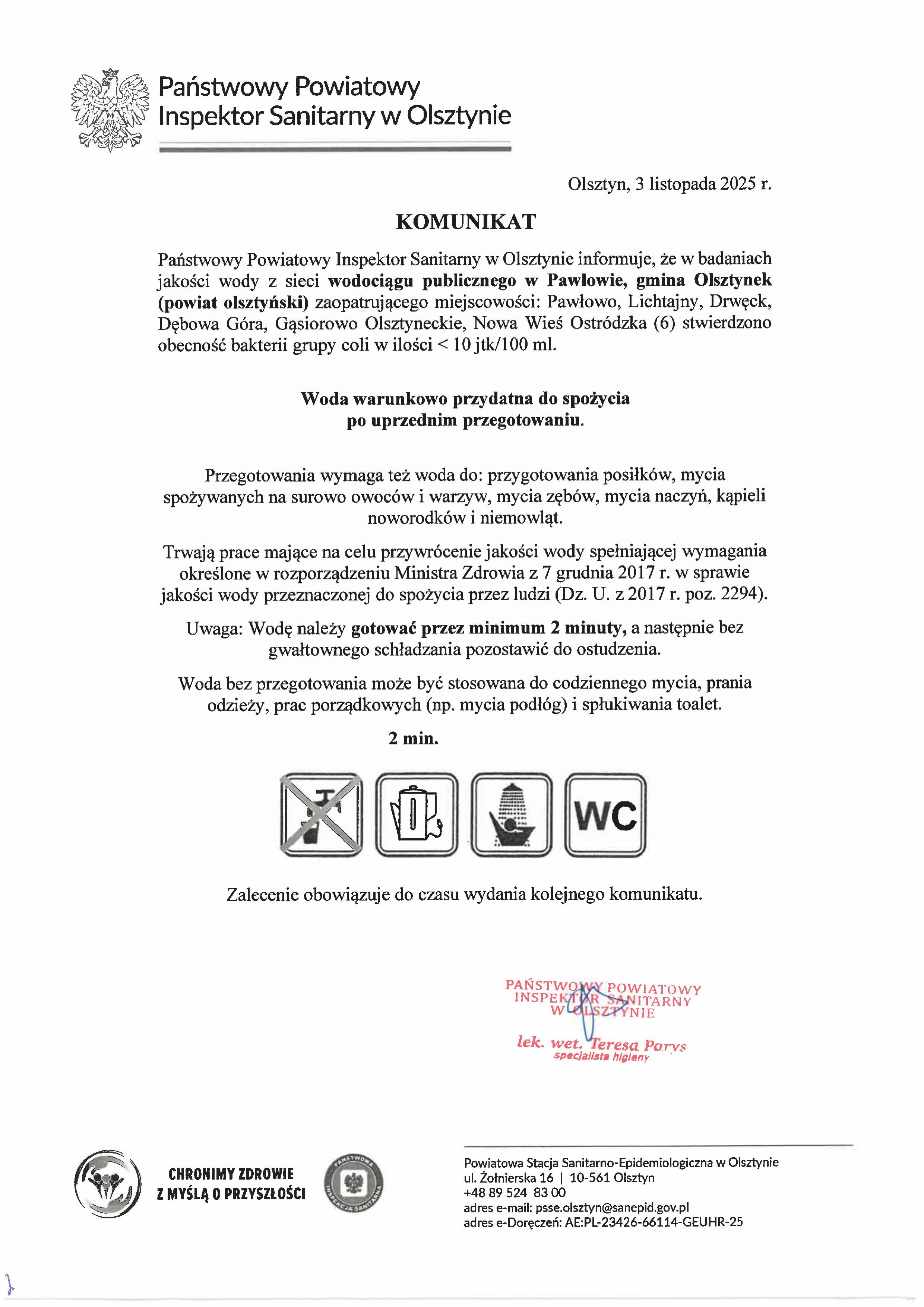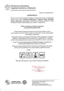Informujemy, iż zgodnie z komunikatem Państwowego Powiatowego Inspektora Sanitarnego stwierdza się warunkową przydatność wody do spożycia z uwagi na przekroczoną zawartość bakterii grupy coli: