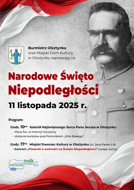 Burmistrz Olsztynka oraz Miejski Dom Kultury w Olsztynku serdecznie zapraszają mieszkańców do wspólnego świętowania Narodowego Święta Niepodległości, które odbędzie się 11 listopada 2025 roku.
