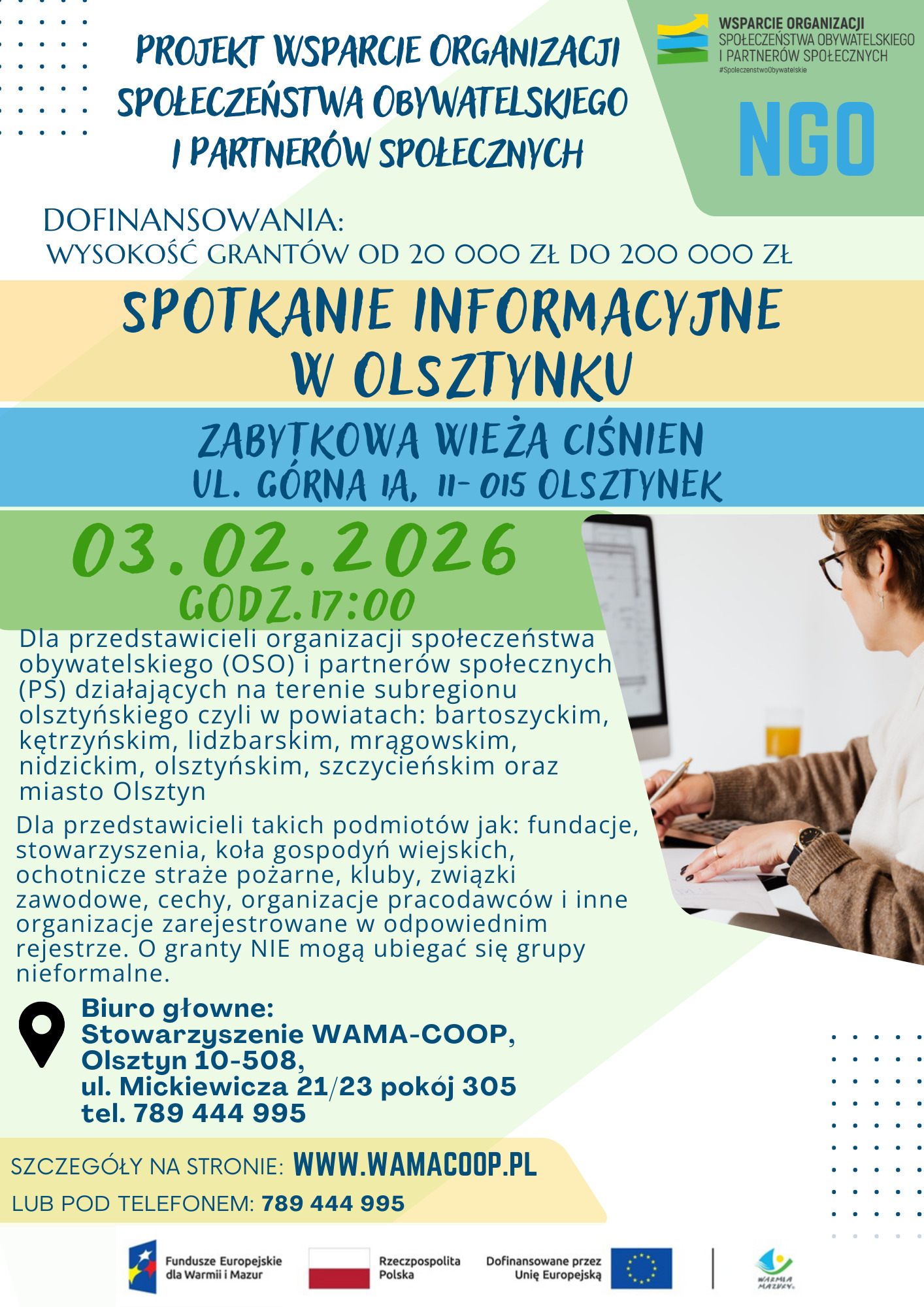 Organizatorem spotkania jest Stowarzyszenie WAMA-COOP. Szczegółowe informacje można uzyskać pod numerem telefonu 789 444 995 lub na stronie internetowej www.wamacoop.pl. Biuro główne znajduje się w Olsztynie przy ulicy Mickiewicza 21/23, pokój 305.