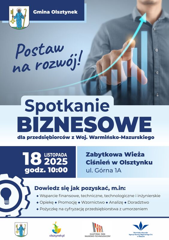 Gmina Olsztynek zaprasza przedsiębiorców z terenu województwa warmińsko-mazurskiego na Spotkanie Biznesowe, które odbędzie się 18 listopada 2025 r. o godz. 10:00 w Zabytkowej Wieży Ciśnień w Olsztynku (ul. Górna 1A).