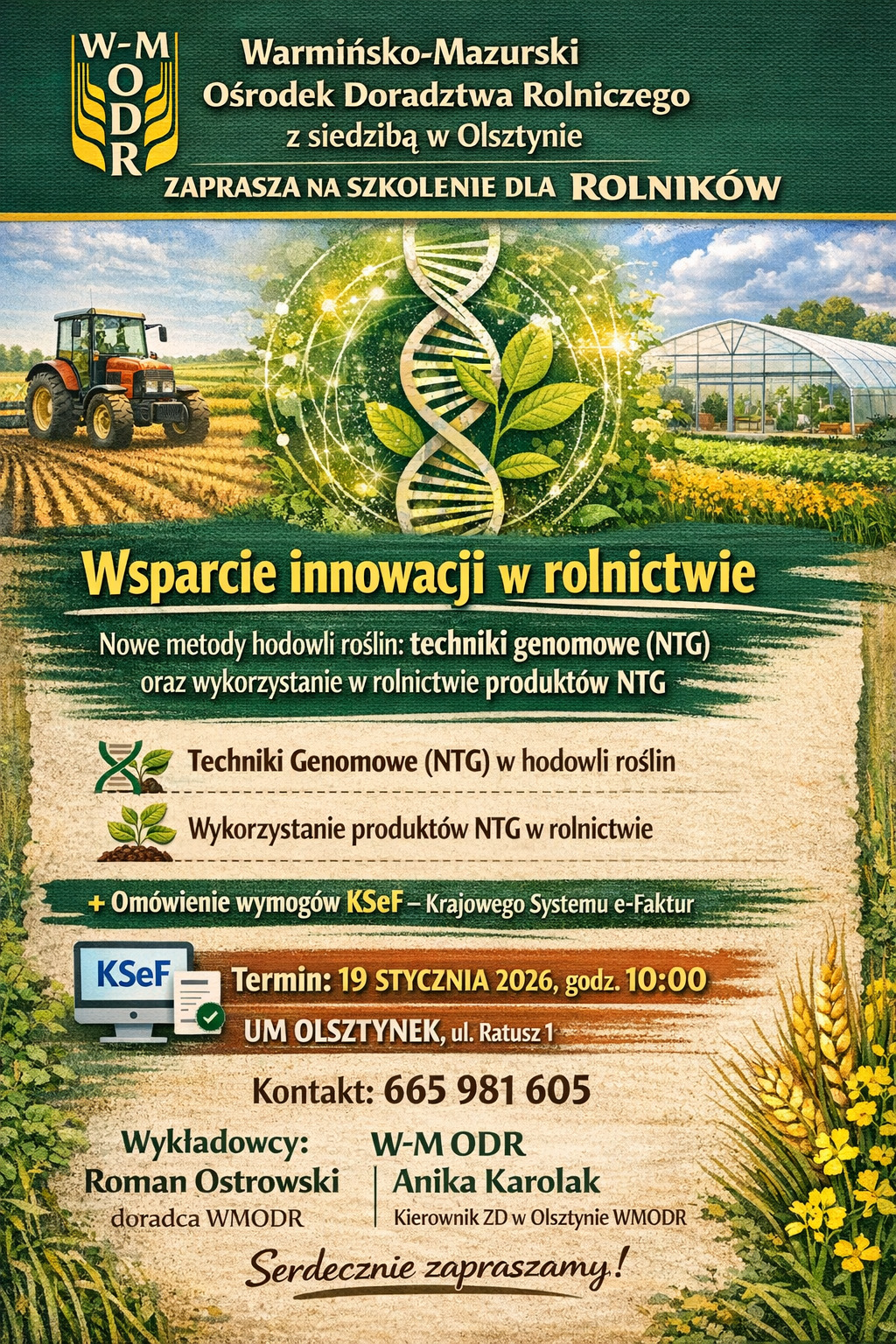 Podczas spotkania omówione zostaną zagadnienia dotyczące nowych metod hodowli roślin, w szczególności technik genomowych (NTG), wykorzystania produktów NTG w rolnictwie, a także obowiązujących wymogów Krajowego Systemu e-Faktur (KSeF).