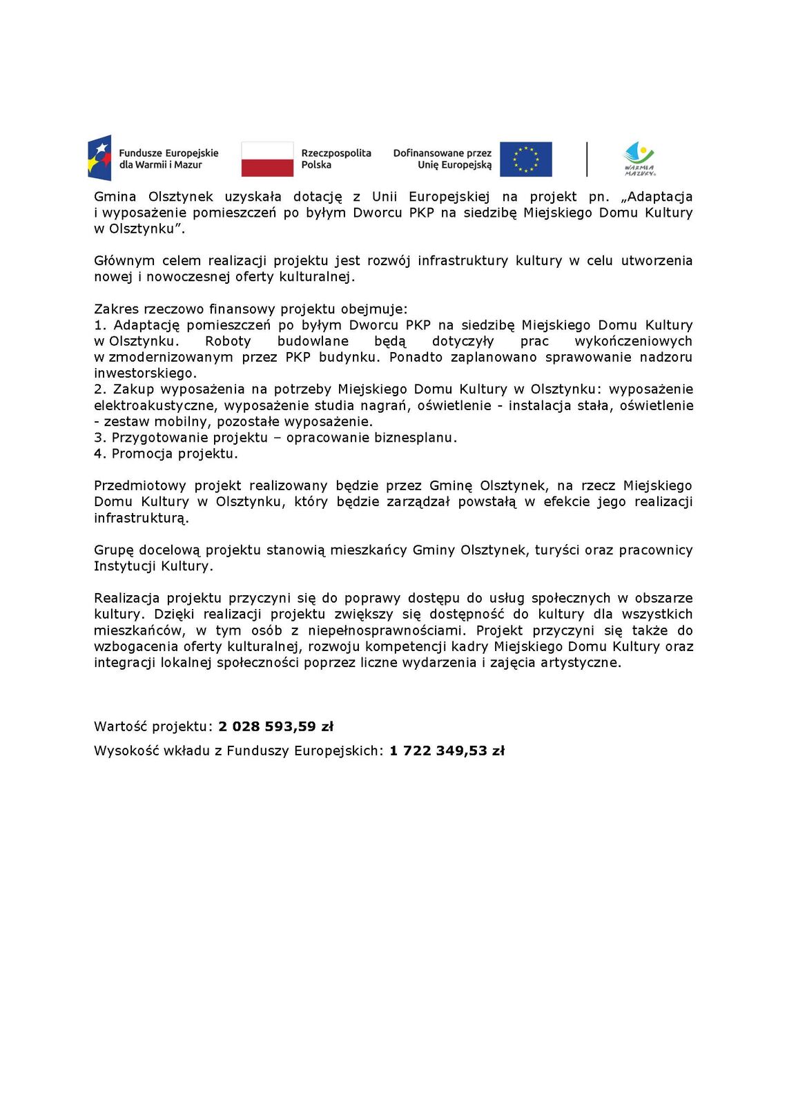 Adaptacja i wyposażenie pomieszczeń po byłym Dworcu PKP na siedzibę Miejskiego Domu Kultury w Olsztynku