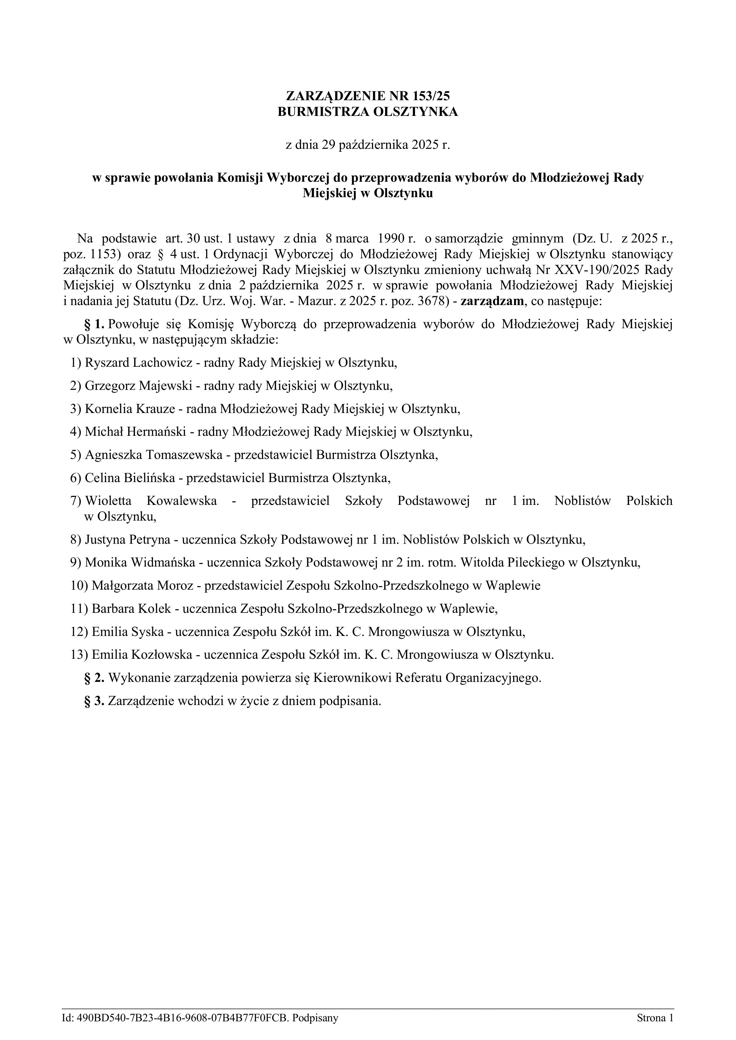 Burmistrz Olsztynka wydał Zarządzenie nr 171/25 z dnia 2 grudnia 2025 r. w sprawie powołania członków Młodzieżowej Rady Miejskiej XI kadencji. Do składu Rady powołano następujące osoby:
