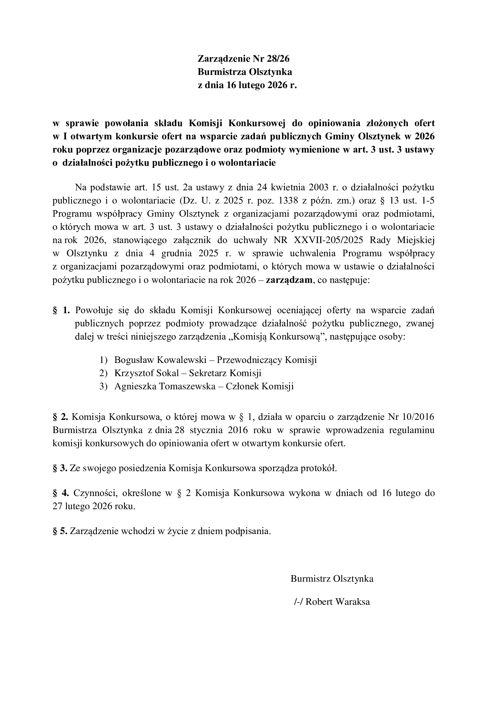 Zarządzenie Burmistrza w sprawie powołania składu Komisji Konkursowej do opiniowania złożonych ofert w I otwartym konkursie ofert na wsparcie zadań publicznych Gminy Olsztynek w 2026 roku