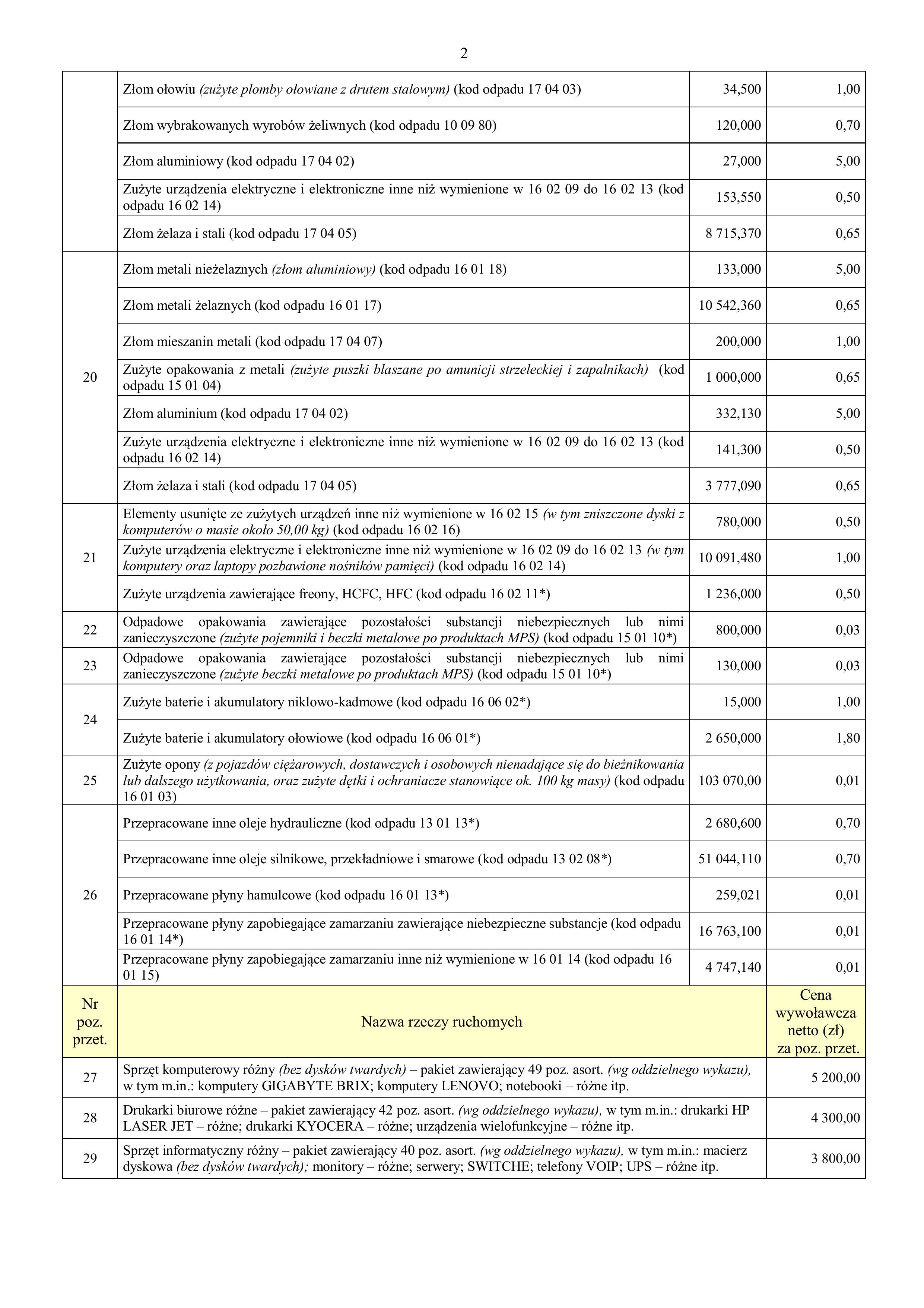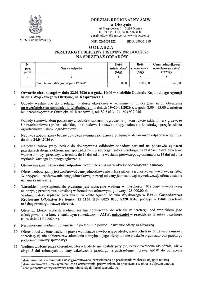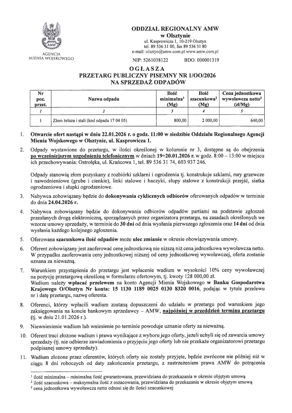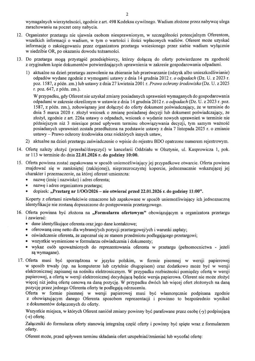 Ogłoszenie o przetargu publicznym pisemnym Nr 1/00/2026 na sprzedaż odpadów