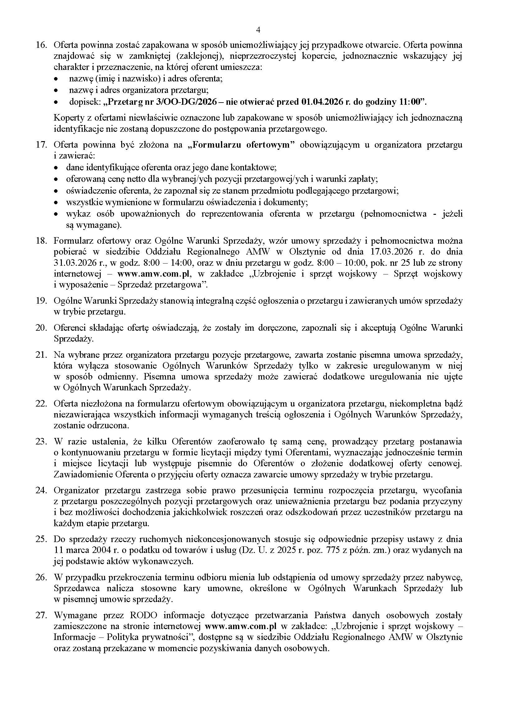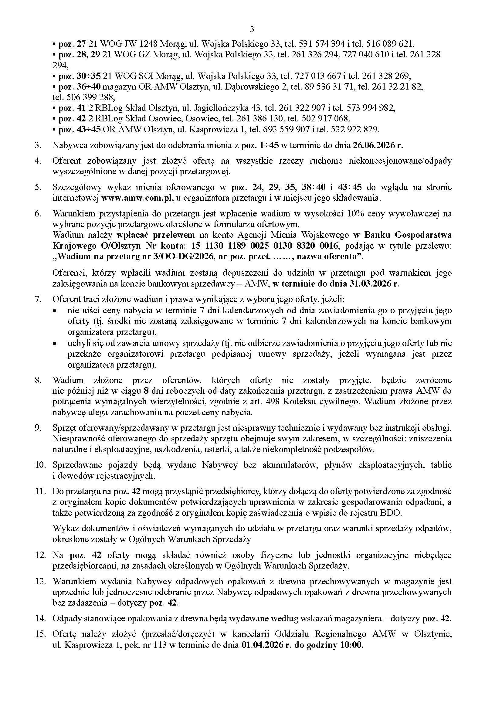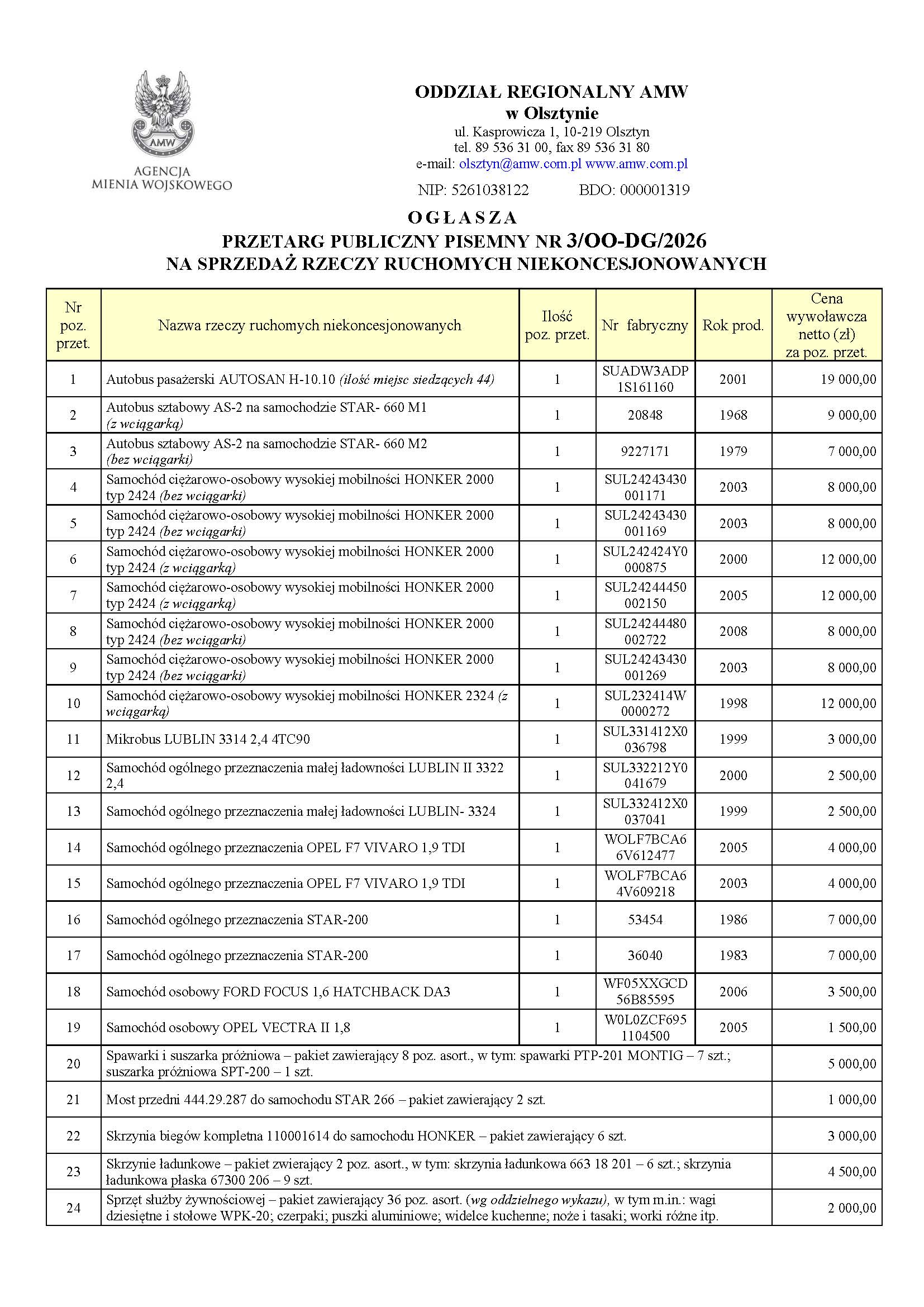 Ogłoszenie o przetargu publicznym pisemnym nr 3/OO-DG/2026 na sprzedaż rzeczy ruchomych niekoncesjonowanych